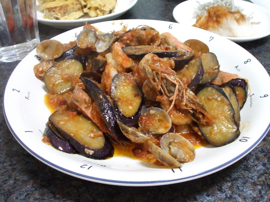 ナスに火が通ったら、魚介も戻しいれ、トマトソースを加えて炒め合わせる。
