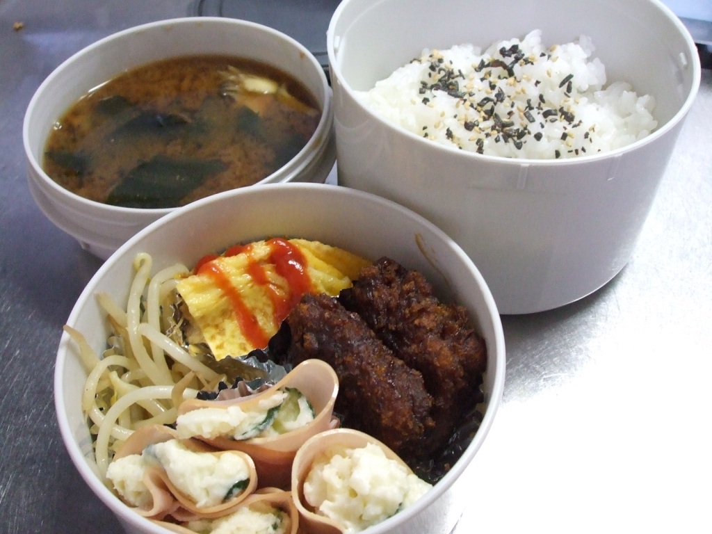 *ポテトサラダ ジャガイモを適当な大きさにカットし水から茹で、柔らかくなったらお湯を捨て水分を飛ばす。塩コショウ、生クリーム少々、バターを入れて混ぜ合わせ、キュウリの塩もみ、辛子マヨネーズを入れて混ぜ合わせる