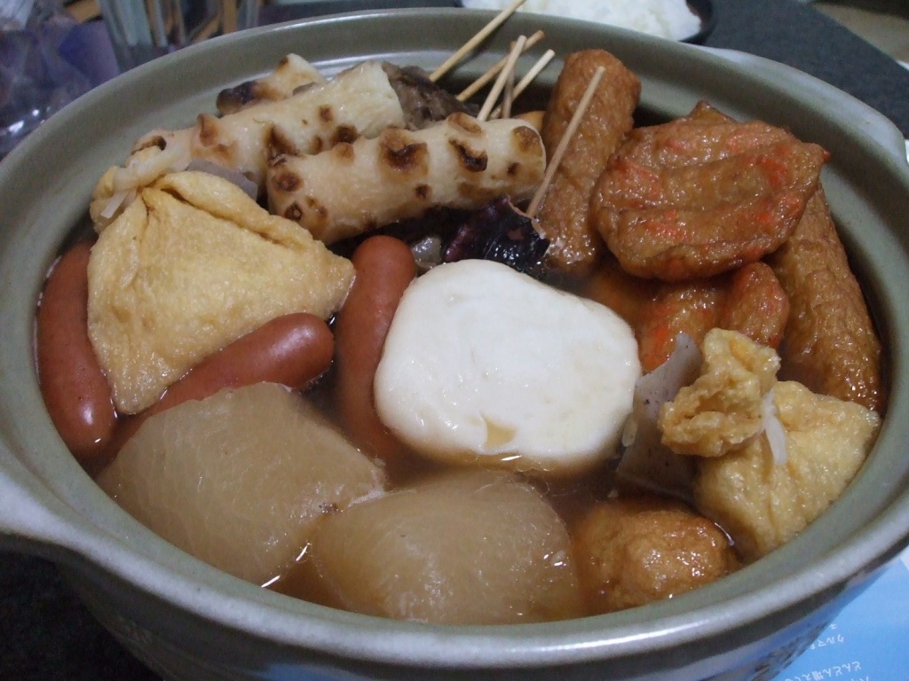 だいこん、にんじん、たまご、牛スジ、練り物、こんにゃく、たこ、ソーセージなんかが入ってます♪
