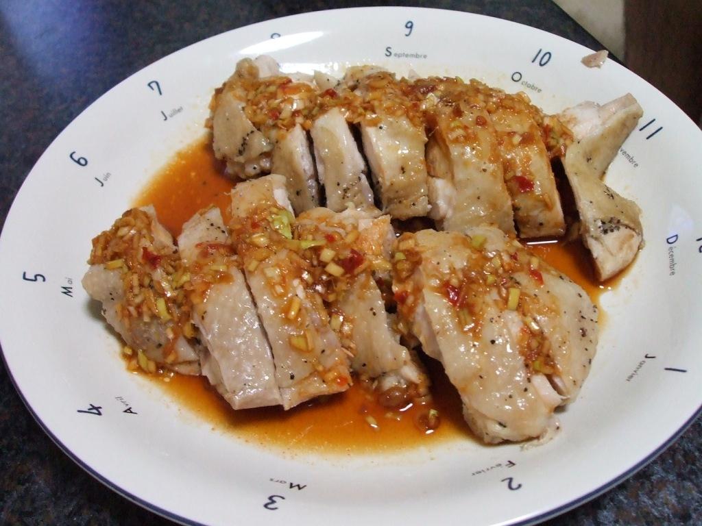 4.(2)の鶏肉が蒸し上がったら、一cm幅に切ってお皿に盛り付け、(3)のソースをかける