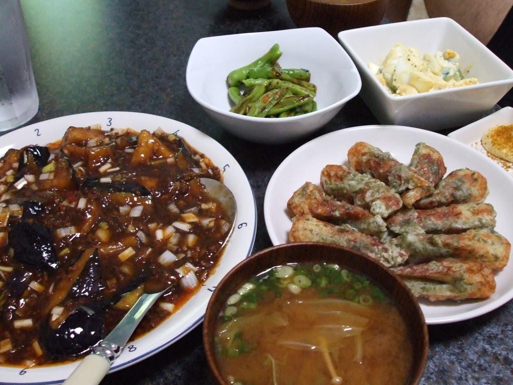 ナスは所々皮を剥いて、乱切りにし見ずにさらしてあく抜きをし、水気を切り片栗粉を薄くまぶして油でカラッと揚げる。
