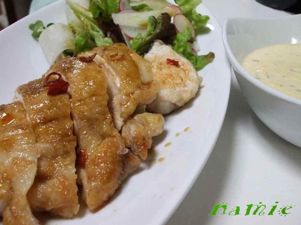 鶏胸肉は塩コショウを振って片栗粉をまぶしてフライパンに多めに油をしいて両面をこんがり焼いたら蓋をして火を消す。時間を置くとゆっくりと中まで火が通るのでジューシーに出来上がります。油で揚げるのが一般的だと思うんだけど、今回はこのやり方で。